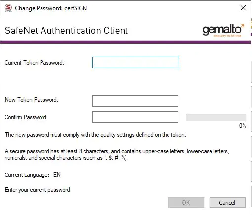 4. In the field Current eToken Password type in the current PIN code of the device (the one printed in the letter you received from certSIGN).