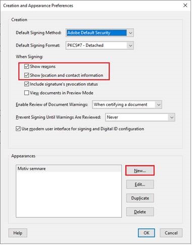 2. Check Show reasons and Show location and contact information, then select New to create a signature layout.