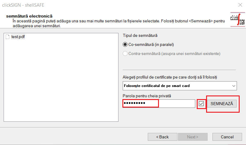 3. In the next window, you need to enter the token PIN code in the Password for the private key field (Parola pentru cheia privată), check the box next to it and click Sign.